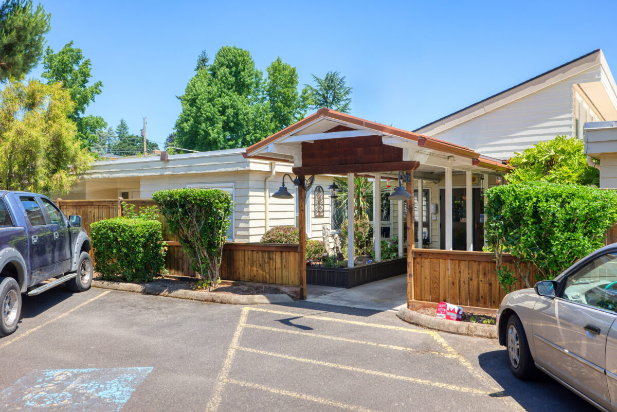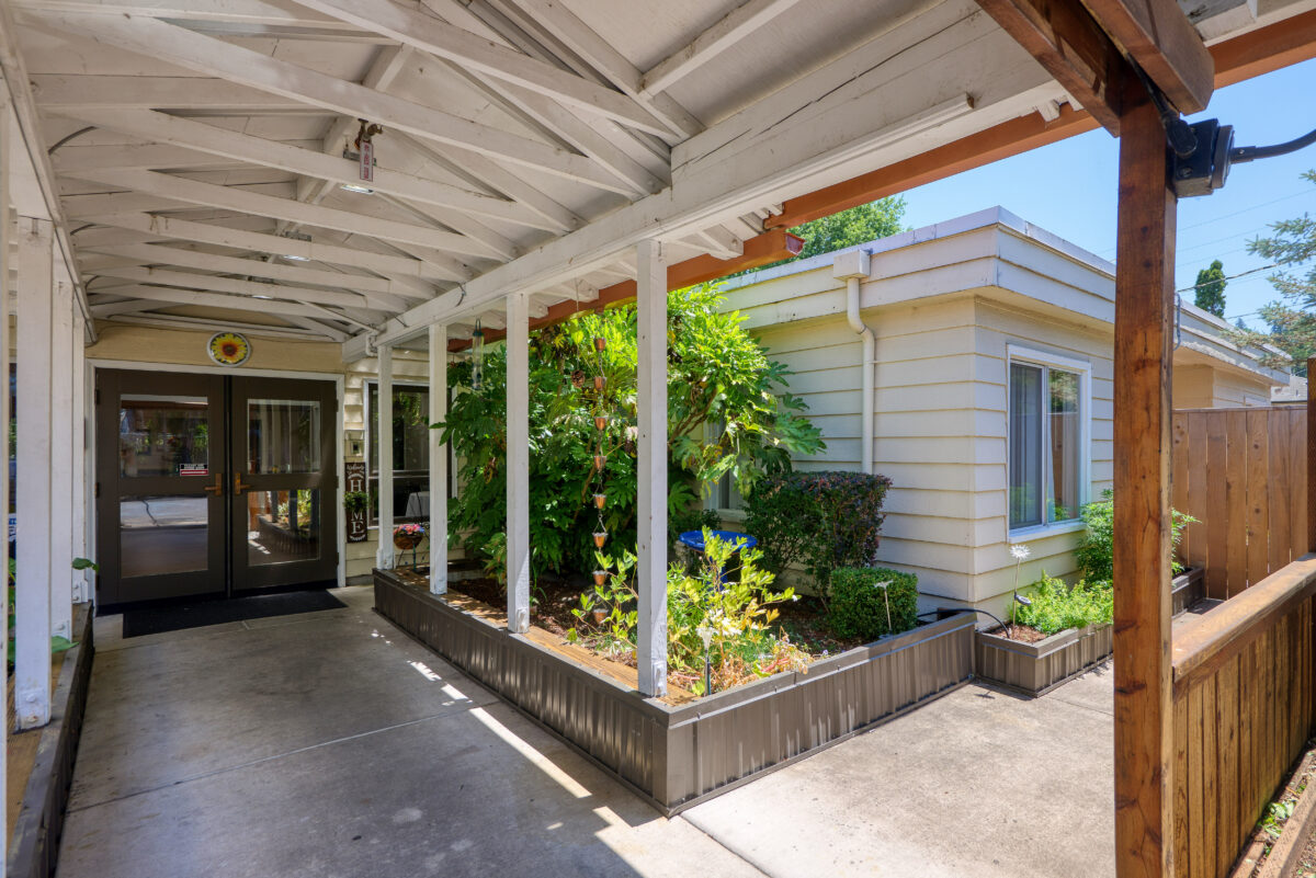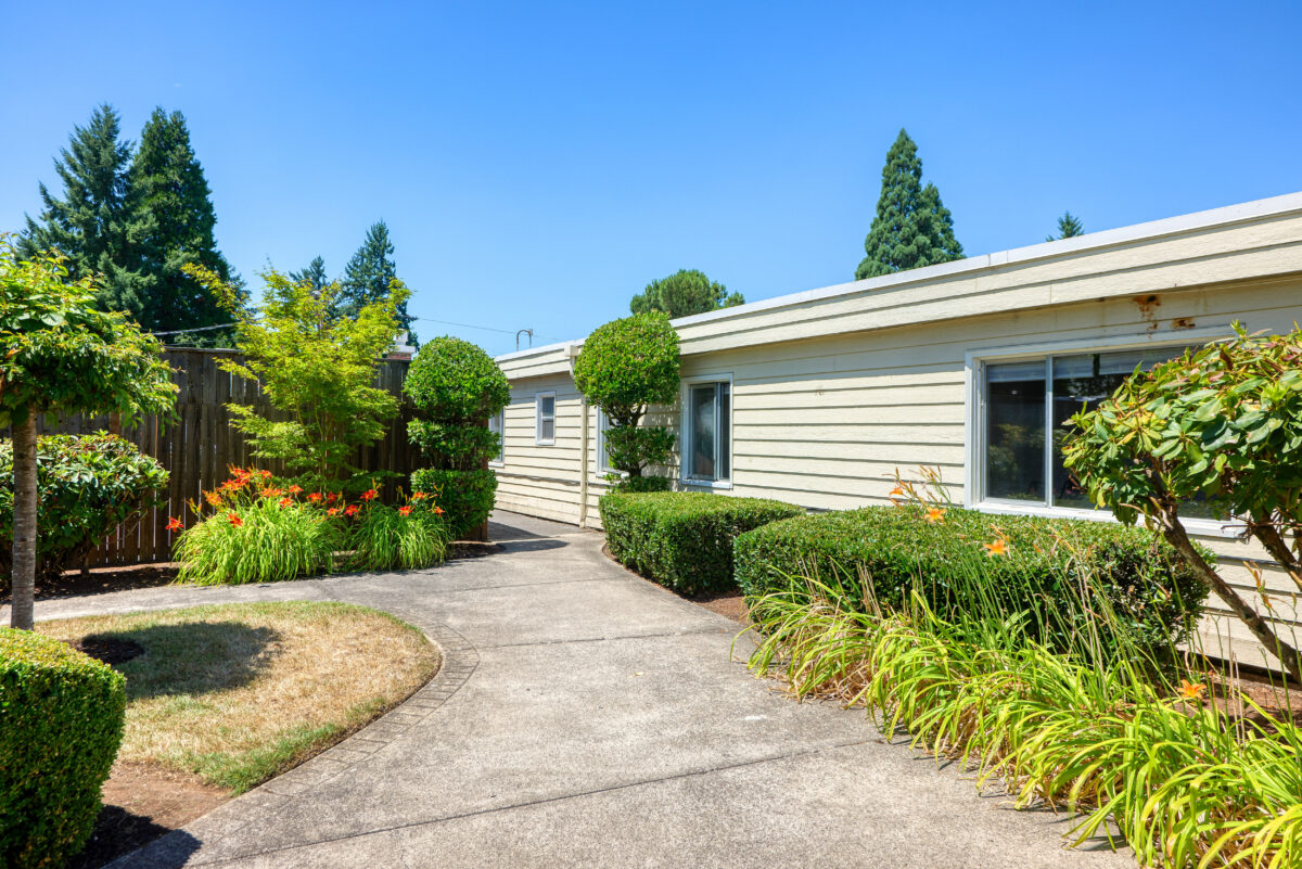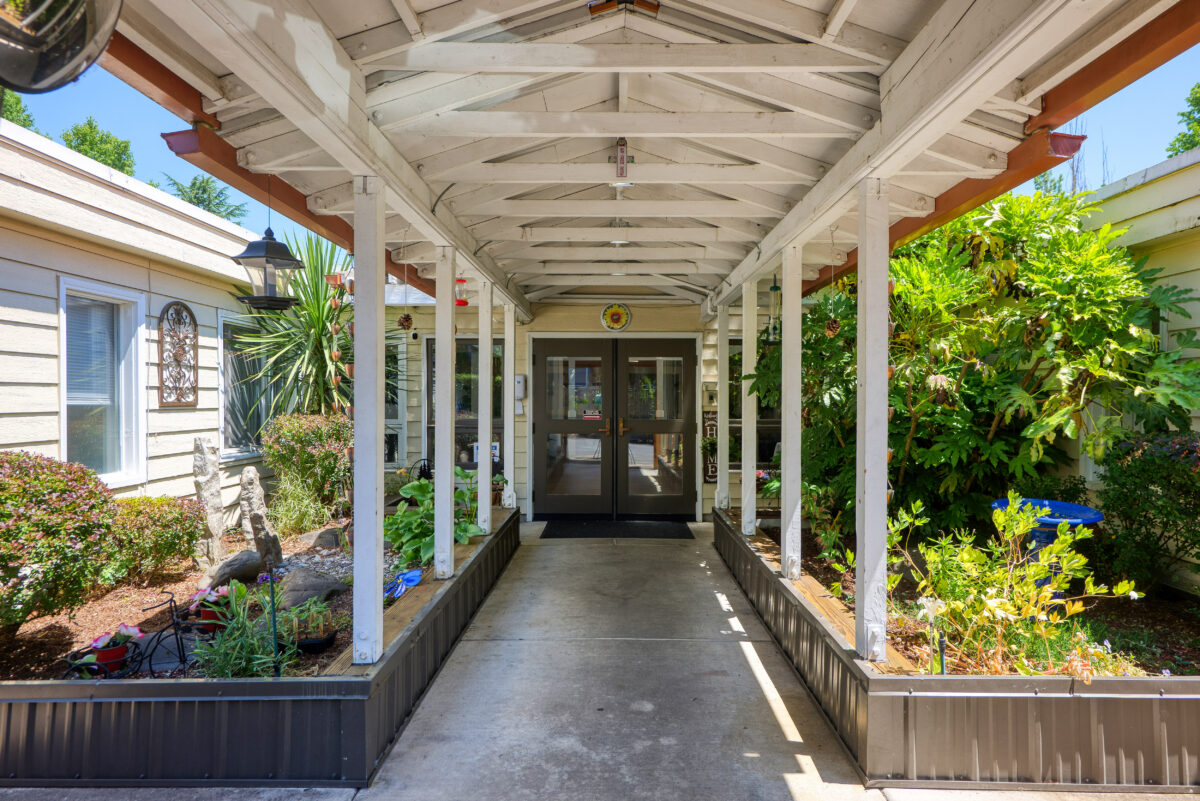 EXTERIOR A front entrance with a covered walkway and white columns, surrounded by a landscaped garden with rocks and flowering plants A wooden gate with a small covered roof, flanked by topiary bushes, leading into a building complex A lush green lawn with a tree, blooming pink bushes, and a paved path Exterior-flowers An elderly man using a cane is supported by a younger man with his arm around his shoulder as they walk down a path lined with trees